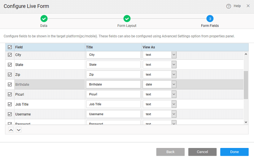 3. Select the fields to be available for the user to interact with. All the fields from the selected data source will be presented for selection.