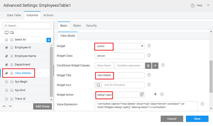 • Go to the parent Page (you can choose it from the Page Structure or from the widget breadcrumb at the bottom of the canvas) and using the Advanced Settings for the Data Table, add a Custom Column to open the Dialog created in the previous step