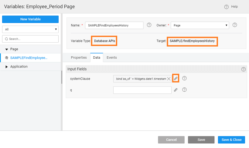 • From the Data tab, using the bind icon next to systemClause Input Field from Use Expression bind it to 'as_of ' + Widgets.date1.timestamp. This will ensure that the rows from the Employees History table are filtered based on the date selected by the user.
