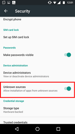 On your android mobile, go to Settings > Security. Enable ‘Unknown sources: Allow installation of apps from unknown sources’
