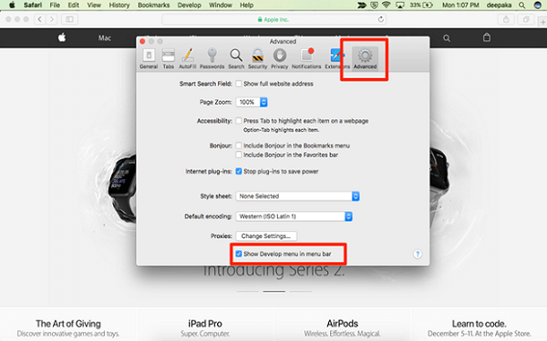 - Go to Advanced and check on ‘Show Develop Menu in menu bar’