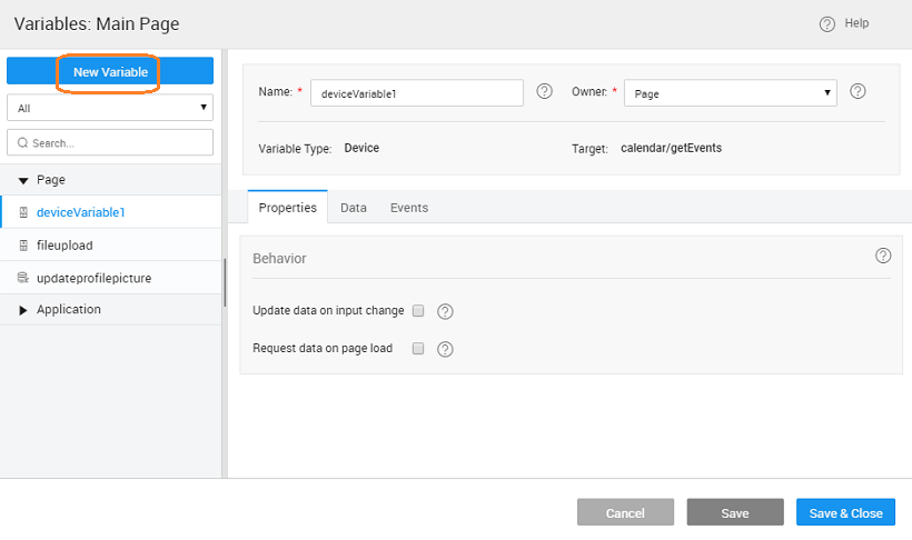 Device Variables are specific to Mobile App projects. These are useful in performing operations specific to a Mobile Device like taking a picture and getting its path, select a contact, add events to a calendar, etc.