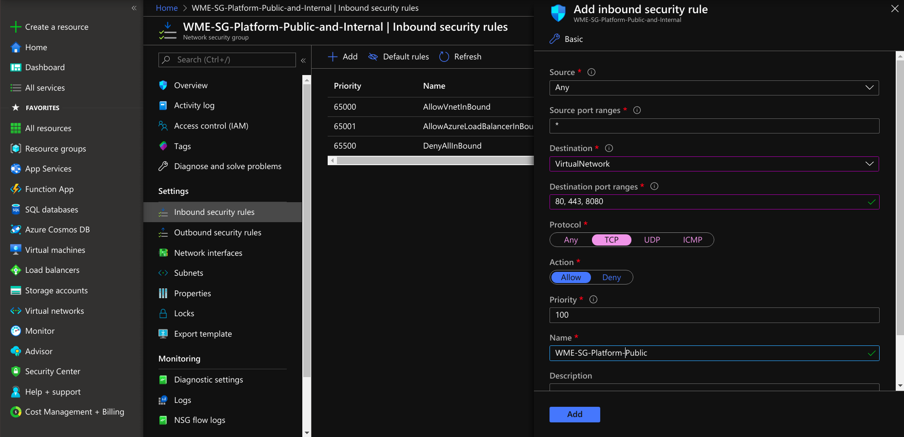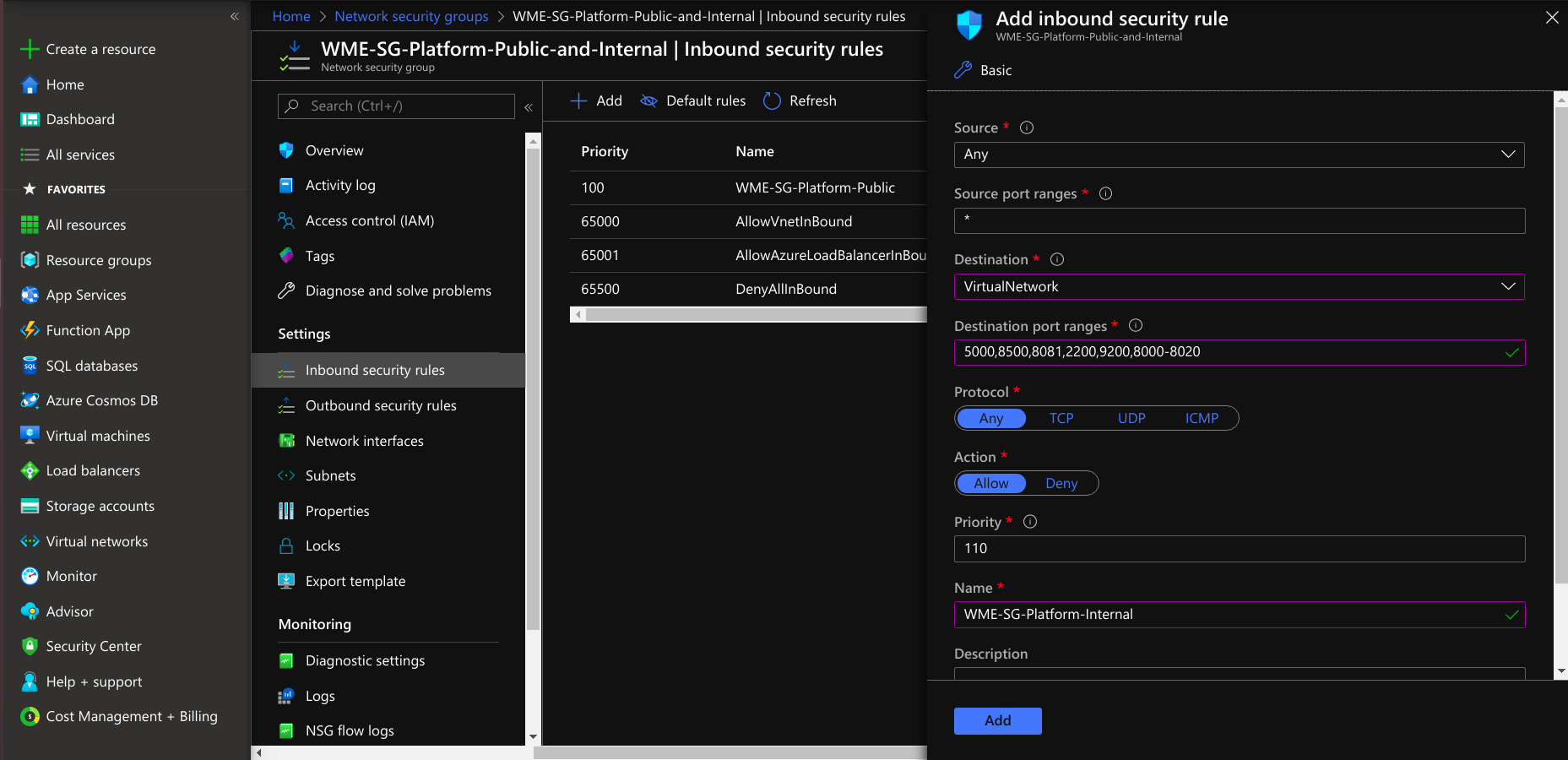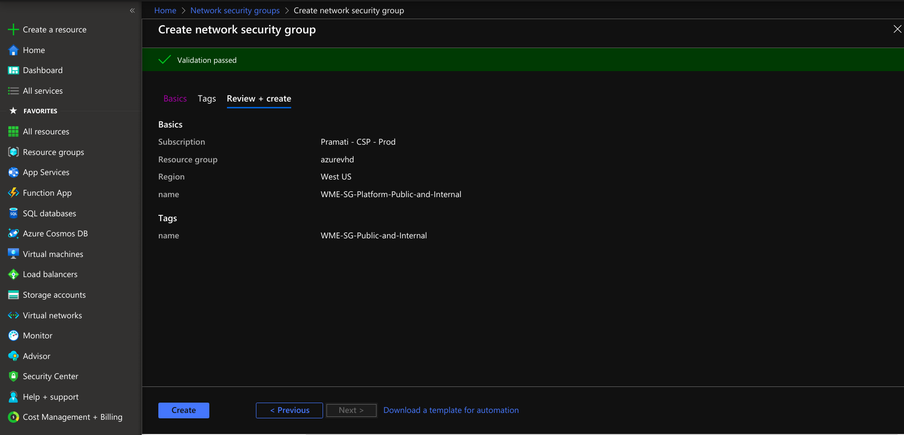 Creating Network Security Group for Platform Virtual Machine