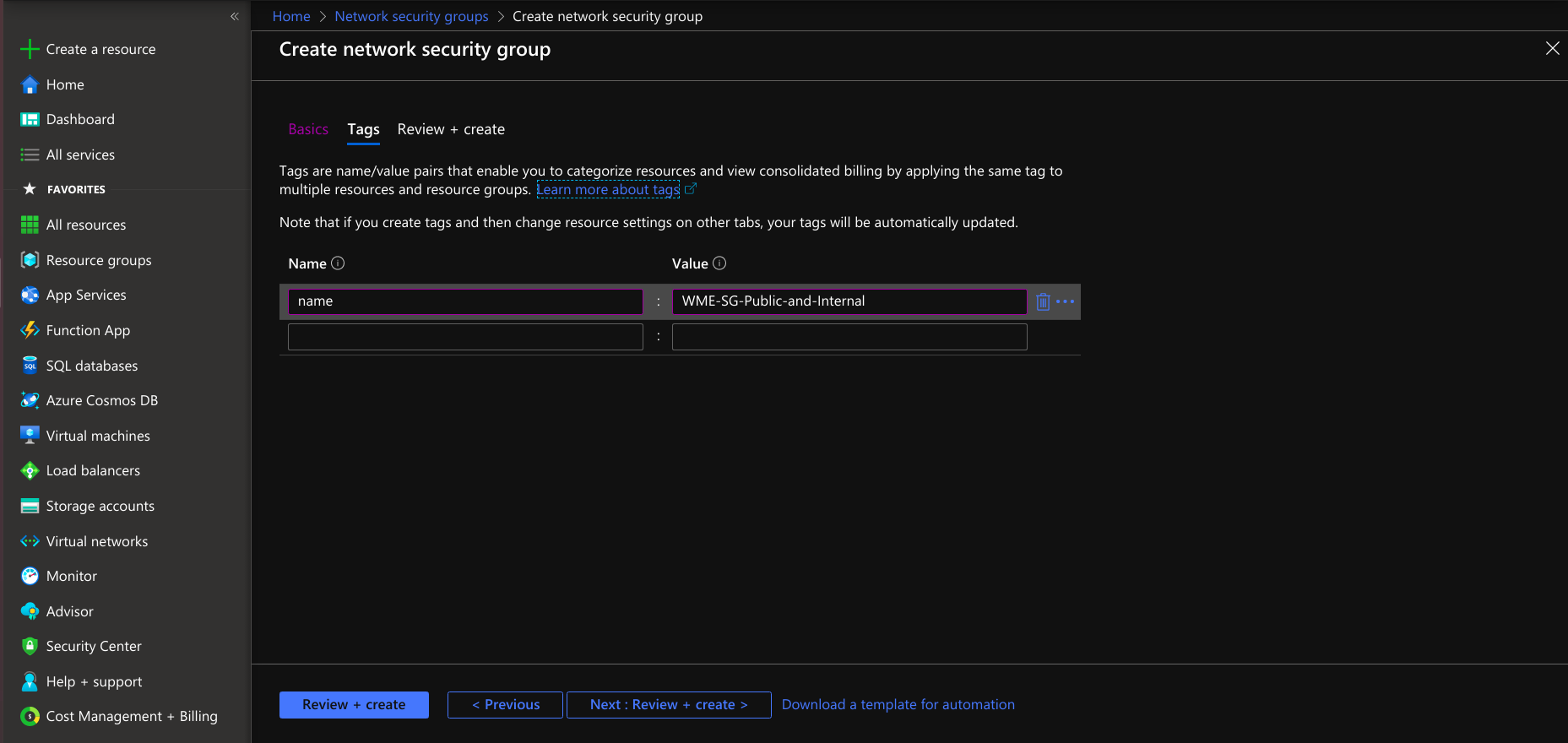 • Provide tags that are name-value pairs for the network security group for categorizing the resources.