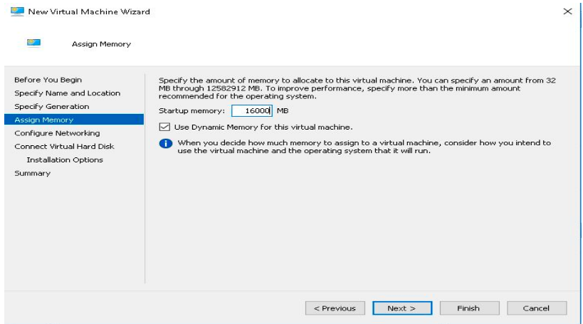 • Enter the memory as 16000 MB. You can use the dynamic memory option as per the requirements and click next.