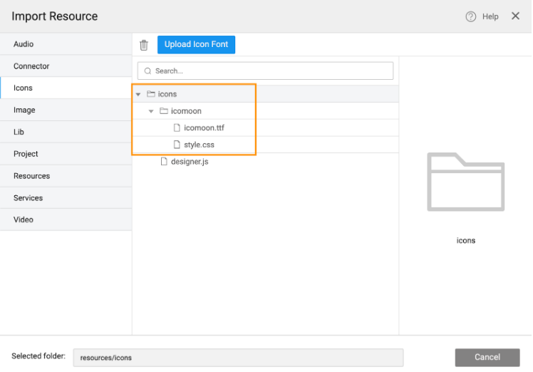 1. Go to the Import Resource dialog to view the imported custom font family in the Icons tree.