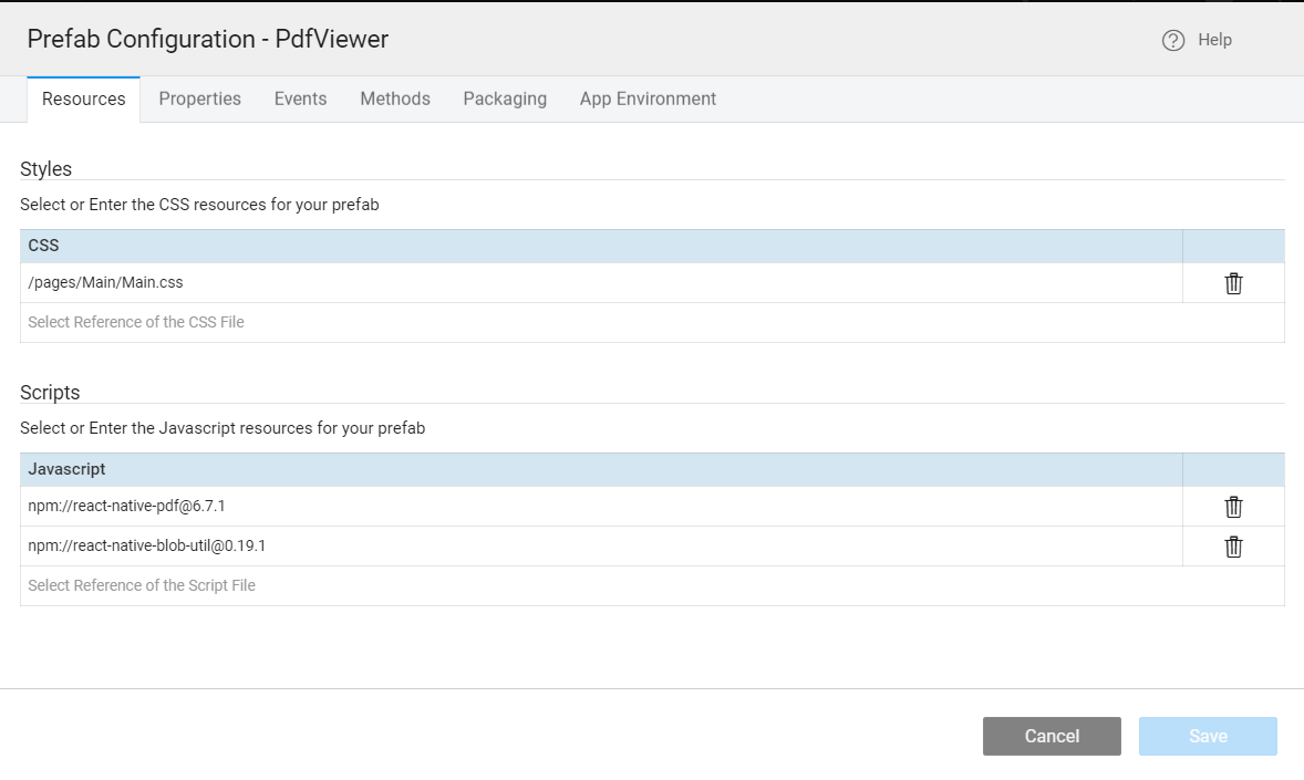 Click on setting then click on Config Prefab. Now, select Resources tab and In Script section add react-native-pdf and react-native-blob-util dependencies to the scripts and then click on save.