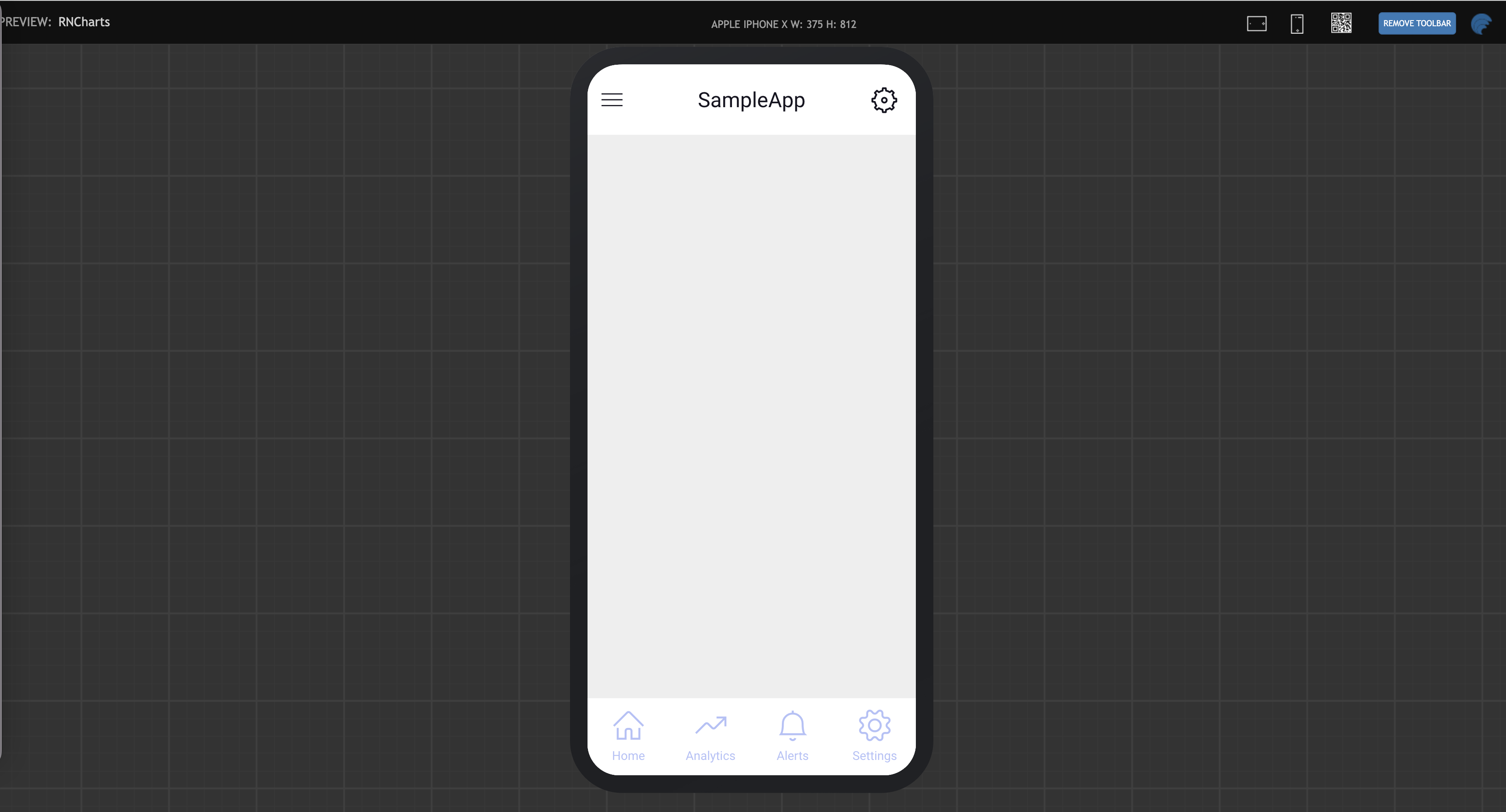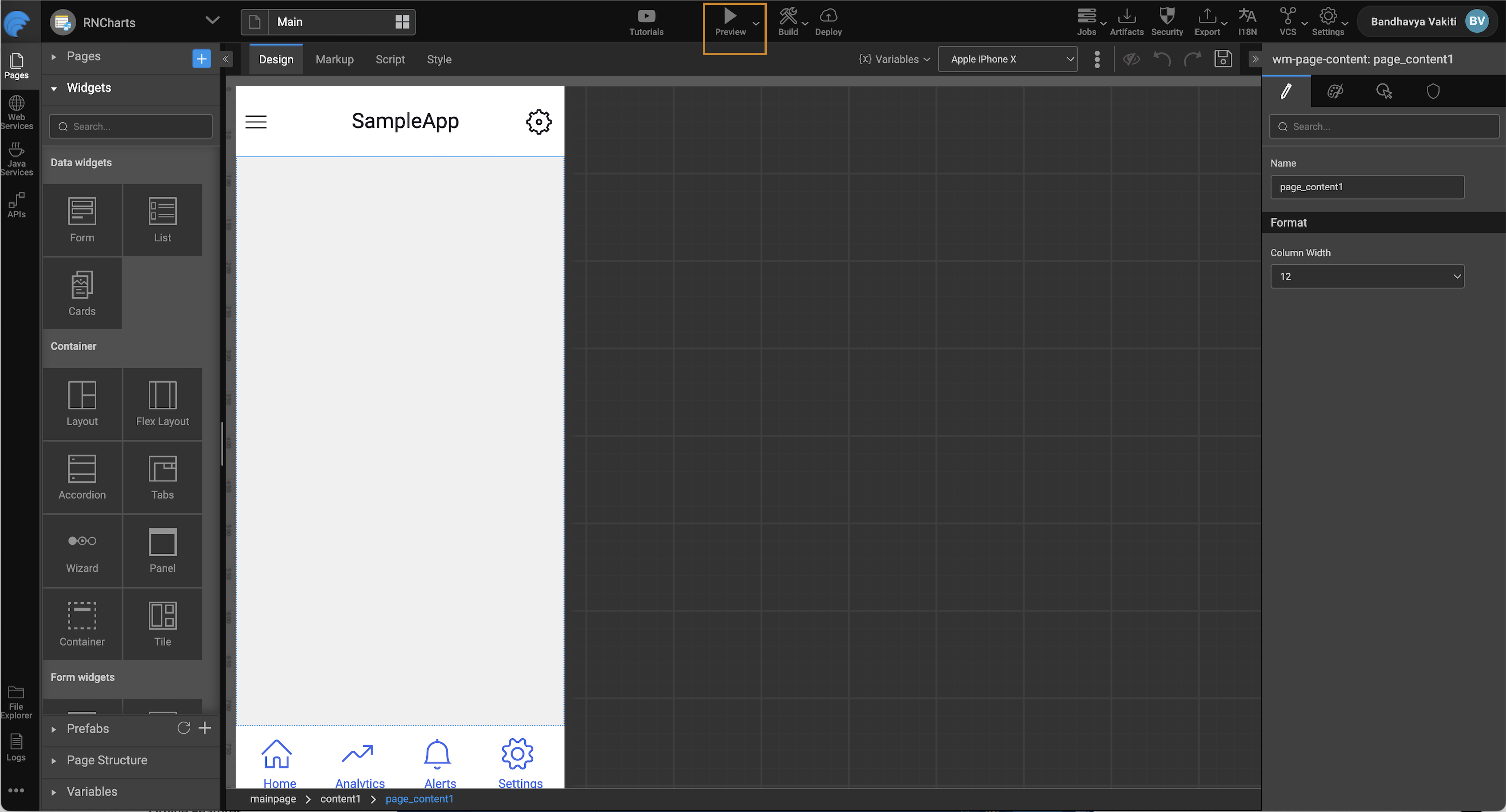• An application preview displays, where one can select the target device to run the app. This action previews the app on various devices, including different phone sizes.